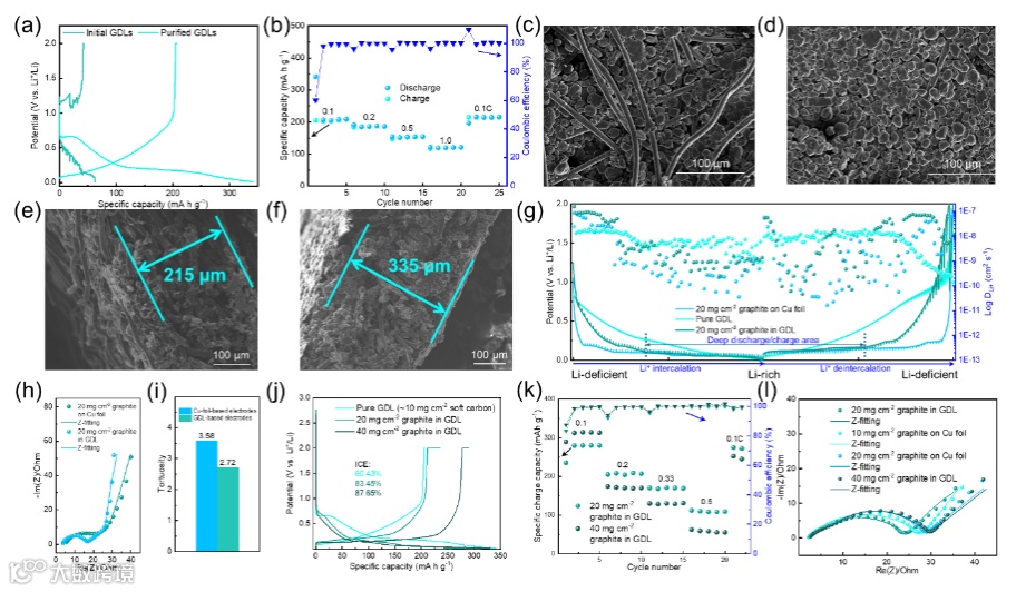 图四:基于 GDL 的负极评估。(a)初始 GDL 负极和纯化裸 GDL 负极半电池在形成周期下的放电/充电曲线。(b)纯化裸 GDL 负极的速率性能。GDL 基负极表面和横截面的扫描电子显微镜图像,石墨负载量分别为 20 毫克平方厘米(c-d)和 40 毫克平方厘米(e-f)。(g)负极电极的 GITT 测试。(h)具有曲折度值的基于铜箔和 GDL 的电极对称电池的等效电路的EIS阻抗图(i)。不同石墨负载量的 GDL 基负极在形成周期下的放电/充电曲线(j)和速率性能(k)。(l)各种石墨负极基半电池的EIS阻抗图。