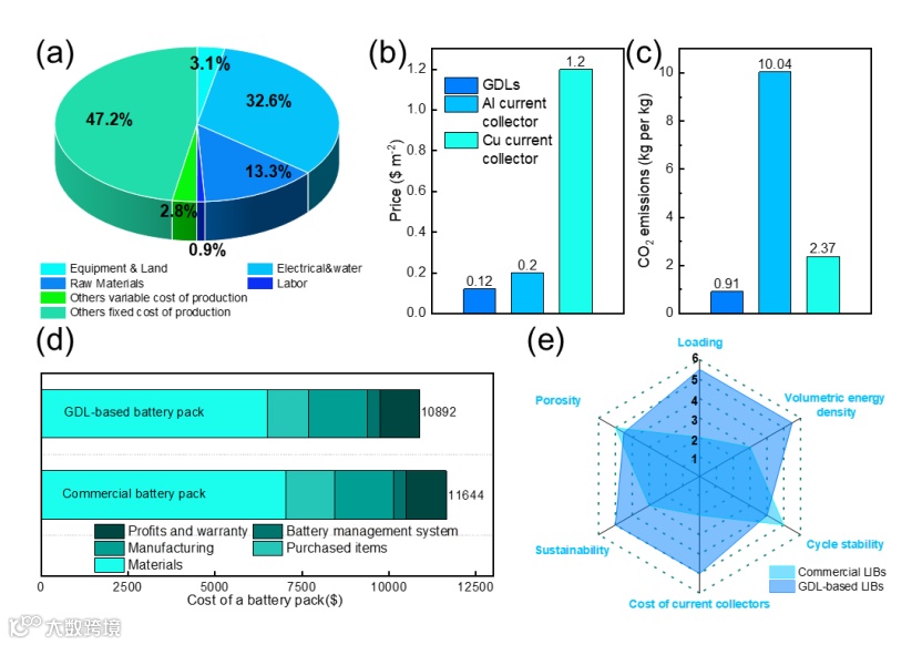图六:基于GDL的电极的经济性和环境可行性评估。(a)纯化GDL合成的成本分布。(b)GDL和传统集流体的价格。(c)GDL和传统集流体的二氧化碳排放量。(d)商业电池和基于GDL的电池组的成本分布。(e)商业电池与基于GDL的电池的综合比较。