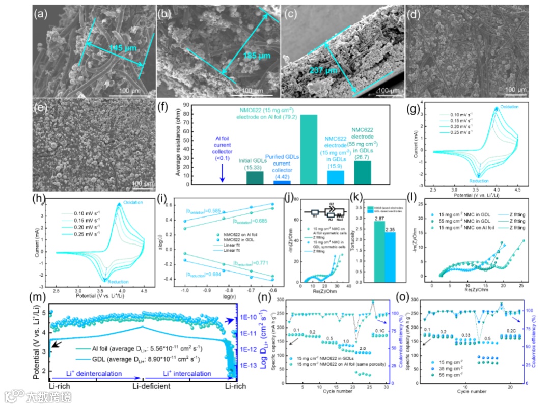 图三. 基于 GDL 的正极评估。GDL 基正极电极在 15(a)、35(b)和 55 毫克/平方厘米负载下的横截面的扫描电子显微镜图像(c)。GDL 基正极在 15(d)和 55 毫克/平方厘米负载下的表面的扫描电子显微镜图像(e)。(f)各种电极材料的电阻测试。铝箔基电极(g)和 GDL 基电极(h)在 15 毫克/平方厘米负载下的循环伏安测试。(i)循环伏安测试的 b 值拟合结果。铝箔基和 GDL 基电极的对称电池的EIS阻抗图(j)以及曲折度值(k)。(l)不同负载下的 GDL 基正极半电池的EIS阻抗图。(m)铝箔基和 GDL 基电极的 GITT 测试。(n)铝箔基和 GDL 基正极半电池的速率性能。(o)不同负载下的 GDL 基电极的倍率性能。