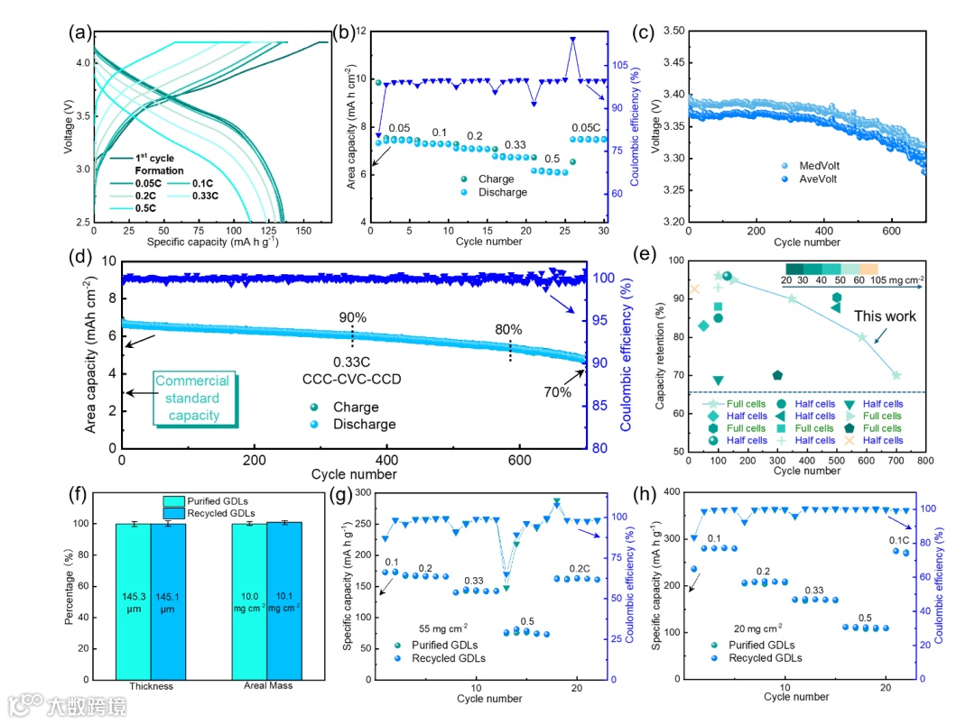 图五:基于 GDL 的高负载全电池评估及 GDL 在电池中的回收工艺。(a)不同电流密度下基于高负载 GDL 的全电池的充放电曲线。(b)基于 GDL 的全电池的倍率性能。(c)基于 GDL 的全电池的中压和平均电压。(d)基于 GDL 的全电池的循环性能。(e)本研究与现有技术的比较。(f)纯化和回收后的 GDL 的厚度及表面积质量。净化的基于 GDL 的阴极电极和回收的基于 GDL 的阳极电极的倍率性能(g)和(h)。