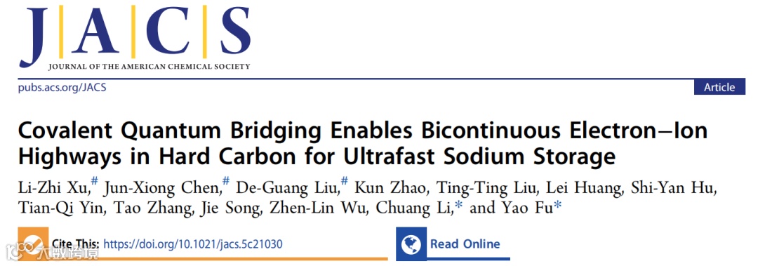 近日,来自中国科学技术大学的傅尧教授、李闯研究员,在国际知名期刊J. Am. Chem. Soc.上发表题为“Covalent Quantum Bridging Enables Bicontinuous Electron–Ion Highways in Hard Carbon for Ultrafast Sodium Storage”的观点文章。该观点文章提出了一种“生物质自组装桥接”新范式,通过“模板-自组装-重构”三段反应调控生物质碳化路径,在硬碳骨架上构建C-C共价键合的石墨化纳米畴(GNDs),同时其边缘被设计成具有高活性的离子吸附和迁移位点,从而在硬碳中实现电子通道(GNDs网络)与离子通道(纳米腔)的原子级协同。