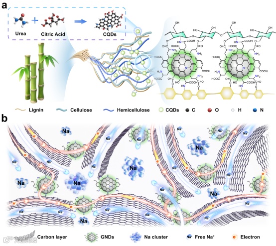 作为钠离子电池(SIBs)最具前景的负极材料,生物质基硬碳的电化学性能直接决定了其能量密度与循环寿命,是迈向大规模应用的核心环节。然而,硬碳的无序碳骨架导致其本征电导率较低且曲离子扩散缓慢,严重制约了SIBs的倍率性能和循环寿命。因此,通过多尺度结构设计和界面优化,协同增强硬碳的电子传输能力与离子扩散动力学,从而实现高倍率下高效、稳定储钠,已成为当前突破SIBs快充瓶颈、迈向实用化亟待攻克的关键科学问题。