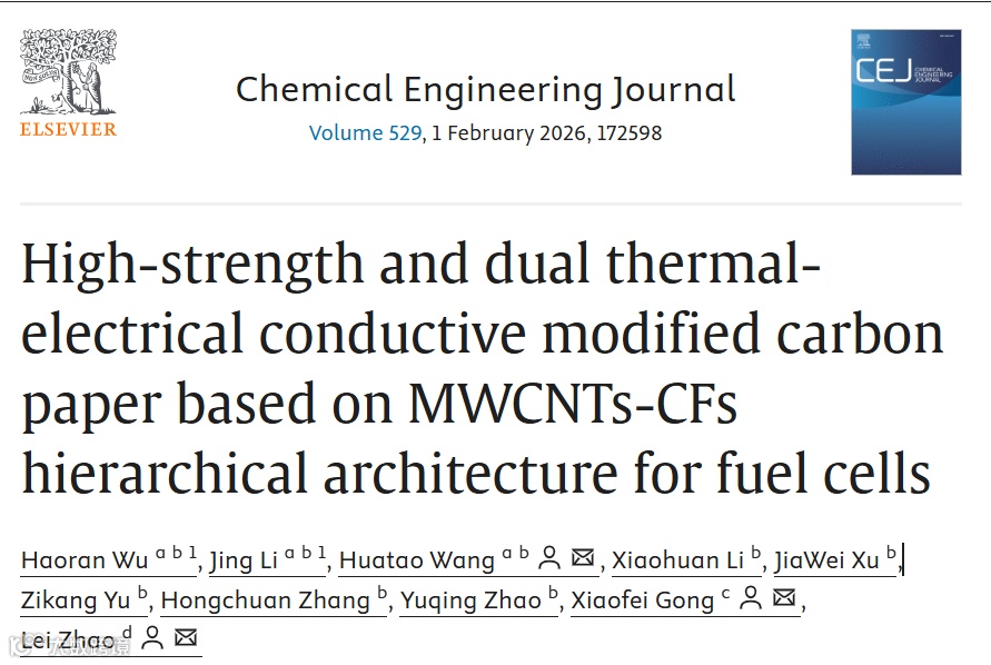 近日,来自哈尔滨工业大学(威海)大学的王华涛教授,在国际知名期刊Chemical Engineering Journal上发表题为“High-strength and dual thermal-electrical conductive modified carbon paper based on MWCNTs-CFs hierarchical architecture for fuel cells”的文章。该文章通过预浸渍的方式向碳纸中引入多壁碳纳米管,使多壁碳纳米管缠绕在碳纤维表面,从而增强了燃料电池用碳纸的力学强度以及导热、导电性能。