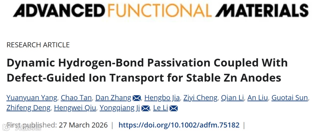 近日,陕西理工大学李乐等人在国际知名期刊Advanced Functional Materials上发表题为“Dynamic Hydrogen-Bond Passivation Coupled with Defect-Guided Ion Transport for Stable Zn Anodes”的研究论文。该研究提出了一种“氢键钝化+缺陷引导”协同的界面调控策略,通过在锌负极表面构筑富含羟基与氧空位的电解衍生氧化锌(EZO)保护层,实现了对界面水活性与锌沉积行为的协同优化。深入揭示了表面羟基与氧空位的协同作用,有效抑制了水诱导的副反应,并引导锌离子实现均匀沉积,为构建高稳定、多体系兼容的水系锌电池提供了新的界面设计范式。