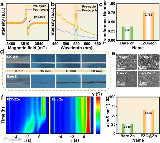 图4. (a) EZO @Zn电极在5.0 mA cm−2电流密度下经过50次循环前后的EPR谱图;(b) EZO @Zn电极循环前后的PL谱图;(c)EZO@Zn与裸锌的离子转移数;(d) 10 mA cm−2电流密度下不同沉积量下锌表面形貌;(e) EZO@Zn涂层与裸锌表面在5.0 mA cm−2电流密度下经过50次循环后的SEM图像(面积容量为1.0 mAh cm−2;(f) EZO @Zn与裸锌的原位弛豫时间分布分析;(g) EZO @Zn与裸锌的离子电导率。