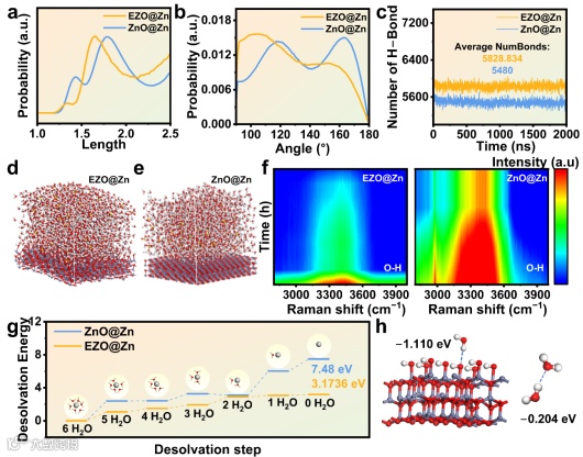 图3. (a) EZO @Zn和氧化锌@Zn界面处氢键的O-O距离分布;(b) EZO@Zn和氧化锌@Zn界面处氢键O–H O角分布;(c) 通过分子动力学分析计算的 EZO @Zn和氧化锌@Zn界面处氢键数;(d) EZO@Zn和(e) 氧化锌@Zn界面处界面结构的分子动力学模拟示意图;(f) 在2 M硫酸锌电解液中,EZO@Zn和氧化锌@Zn界面处水信号的拉曼光谱;(g) 水合Zn2+在EZO@Zn和氧化锌@Zn界面处的逐步脱溶剂化能;(h) 通过分子动力学分析计算的EZO@Zn和氧化锌@Zn界面处氢键能。