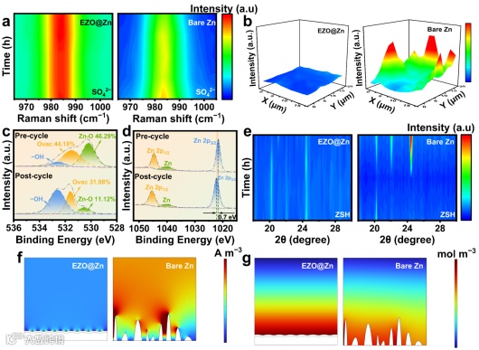 图5. (a) 在2 M硫酸锌电解液中,EZO@Zn与裸Zn电极在10 mA cm−2恒电流循环过程中的原位拉曼光谱;(b) 裸铜表面与EZO@Cu表面副产物的拉曼映射。(c) EZO@Zn在30次循环前后的高分辨率O 1s光谱对比;(d) EZO@Zn在30次循环前后的高分辨率Zn 2p光谱对比;(e) EZO@Zn与裸Zn在锌沉积过程中的原位XRD强度变化;(f) EZO @Zn与裸Zn的模拟电流密度分布。EZO@Zn与裸Zn的模拟电流密度分布。色条表示相对于最大电流密度的归一化值(无量纲);(g) EZO@Zn与裸Zn的模拟离子浓度分布。色条表示相对于最大Zn2+浓度的归一化值(无量纲)。
