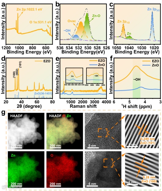 图2. (a) XPS全谱;(b) 高分辨Zn 2p谱;(c) 高分辨O 1s谱;(d) EZO的XRD图谱;(e) EZO与商用ZnO的拉曼光谱对比;(f) EZO样品与商用ZnO的固态¹H核磁共振谱;(g) 高分辨透射电镜图像及晶格间距。
