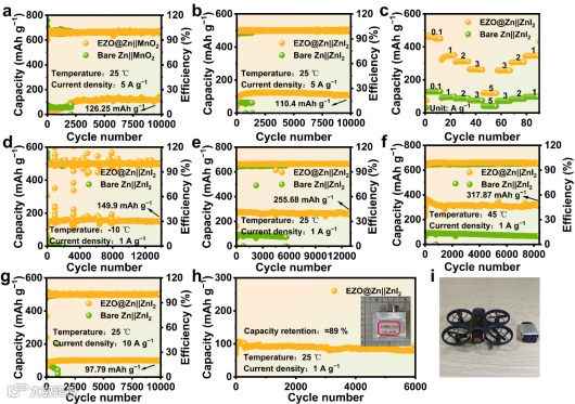 图6. (a) EZO@Zn||MnO2和裸Zn||MnO2全电池在5 A g-1下的长期循环稳定性测试;(b) EZO @Zn|||ZnI2和裸Zn|||ZnI2全电池在5 A g-1电流密度下的长期循环稳定性测试;(c) EZO @Zn||ZnI2和裸Zn|||ZnI2全电池在不同电流密度下的速率性能比较;(d) EZO @Zn|||ZnI2和裸Zn|||ZnI2全电池在−10 ℃和1 A g-1条件下的性能;(e) EZO @Zn|||ZnI2和裸Zn|||ZnI2全电池在25 ℃和1 A g-1条件下的性能;(f) EZO @Zn|||ZnI2和裸Zn|||ZnI2全电池在45 ℃和1 A g-1条件下的性能;(g) EZO @Zn|||ZnI2和裸Zn|||ZnI2全电池在25 ℃和10 A g-1条件下的性能;(h) EZO @Zn|||ZnI2软包电池在1 A g-1电流密度下的长期循环稳定性测试;(i) 软包电池尺寸与应用示意图。