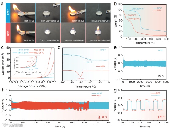 图3. NPST 电解液热稳定性和基本电化学性能表征。