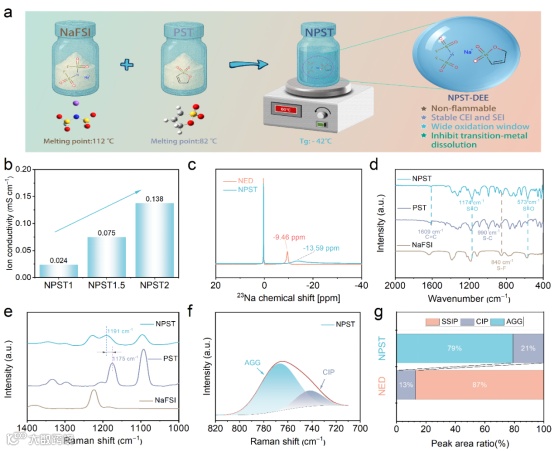 图1. NPST 电解液制备过程及其溶剂化结构表征。