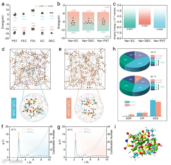 图2. NPST 的电子结构、配位能与 MD 溶剂化模型。