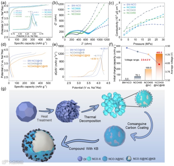 Figure 3 (a) First charge-discharge curves of BM-NCO and NCO-X (the inset is the corresponding dQ/dV curves). (b) EIS testing and (c) powder conductivity testing of BM-NCO and NCO-X. (d) Electrochemical performance testing after compounding with KB and (e) dQ/dV curves. (f) Irreversible specific capacity loss and variations in decomposition voltage during material optimization. (g) Schematic illustration of the modification process.