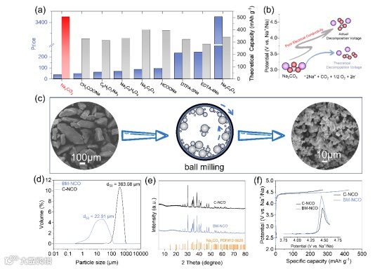 Figure 1 (a) Theoretical specific capacity and corresponding price of some organic sodium compensation additives. (b) Theoretical (actual) decomposition voltage of Na2CO3. (c) Morphologies. (d) Particle size analysis and (e) XRD patterns of C-NCO and BM-NCO. (f) Charge-discharge curves within the voltage range of 2.5-4.6 V (inset: dQ/dV curves) of C-NCO and BM-NCO.