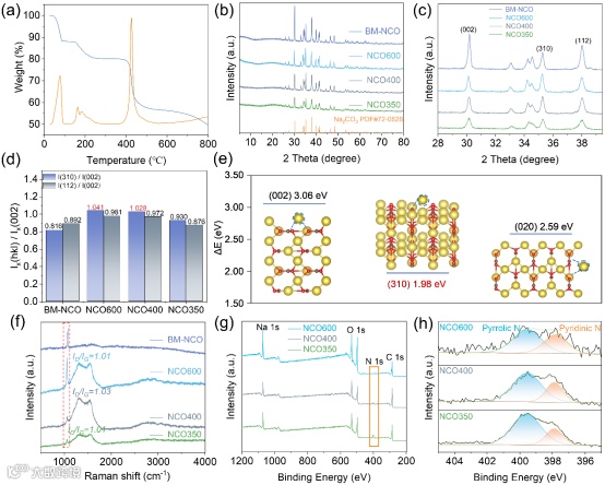 Figure 2 (a) Thermogravimetric curve of IDA-2Na. (b) XRD and (c) the corresponding enlarged image of 28-39.5 degrees. (d) Intensity of (310) and (112) planes relative to the (002) plane. (e) Binding energy of sodium ion adsorption/desorption on crystal planes. (f) Raman analysis. (g, h) XPS full spectra scan and N1s high-resolution spectra.