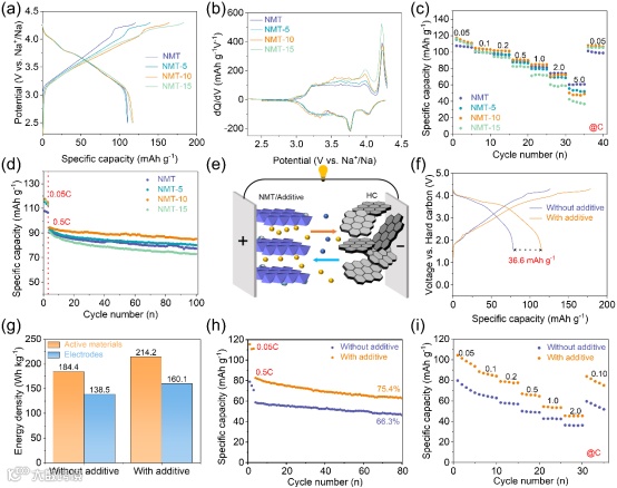 Figure 5 (a) First charge-discharge curves of NMT and NMT-X half-cells and the corresponding. (b) dQ/dV curves. Comparison of (c) rate performance and (d) long-cycle performance. (e) Schematic diagram of full cells with additives. (f) First charge-discharge curves of full cells with or without additives and the corresponding (g) energy density. Comparison of (h) cycling and (i) rate performance.