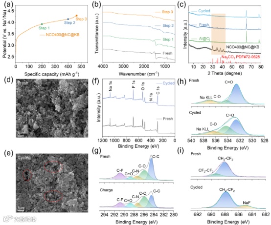 Figure 4 (a) The first charge curve and (b) FTIR result for the fresh and cycled electrode of NCO400@NC@KB. (c) Ex situ XRD pattern for pristine and full-charged electrodes of NCO400@NC@KB. (d, e) FESEM images for the fresh and cycled electrode of NCO400@NC@KB. (f) XPS full-spectrum after cycled and (g) C1s, (h) O1s, and (i) F1s high-resolution spectra.