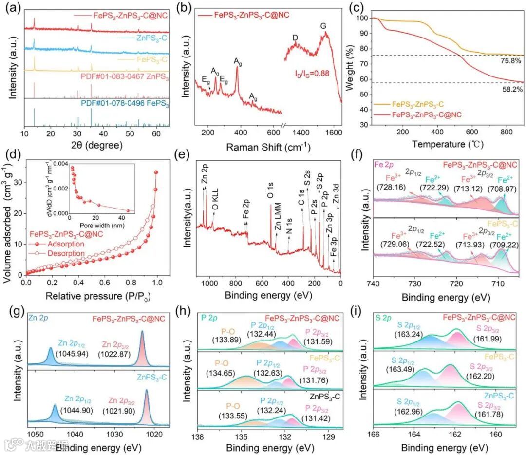 图2. (a) FePS3‑C、ZnPS3‑C 及 FePS3‑ZnPS3‑C@NC 样品的 XRD 图谱;(b) FePS3‑ZnPS3‑C@NC 的拉曼光谱;(c) FePS3‑ZnPS3‑C 与 FePS3‑ZnPS3‑C@NC 的热重曲线;(d) FePS3‑ZnPS3‑C@NC 的氮气吸脱附等温线及孔径分布曲线;FePS3‑ZnPS3‑C@NC 的 XPS (e) 全谱及 (f) Fe 2p、(g) Zn 2p、(h) P 2p 与 (i) S 2p 精细谱。