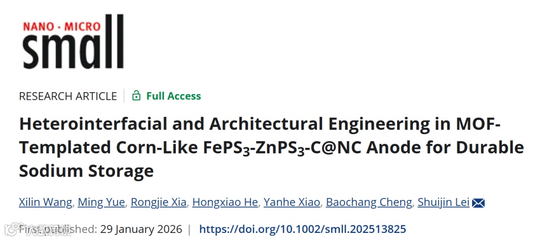 近日,来自南昌大学的雷水金教授,在国际权威期刊Small上发表题为“Heterointerfacial and Architectural Engineering in MOF-Templated Corn-Like FePS3-ZnPS3-C@NC Anode for Durable Sodium Storage”的研究文章。该工作提出了一种创新的多层次设计策略,成功构建了独特的玉米状MIL88B@ZIF8(MOFonMOF)核壳前驱体。通过对该前驱体进行硫化处理、精确调控的原位聚多巴胺包覆以及同步碳化/磷硫化,制备出FePS3ZnPS3C@NC复合材料。该复合材料展现出显著的多级协同效应:1)聚多巴胺衍生的氮掺杂碳层与MOF衍生的碳基体协同作用,有效缓冲了电化学循环中的体积应变,同时提升了整体导电性;2)FePS3/ZnPS3异质界面处形成的强内置电场显著增强了MPS3材料的电荷传输能力,大幅促进了Na+反应动力学。该研究不仅为合理构建MOF衍生异质结构提供了普适性方法,同时突破了MPS3负极的关键性能瓶颈,为新型钠离子电池电极材料的设计提供了重要参考。