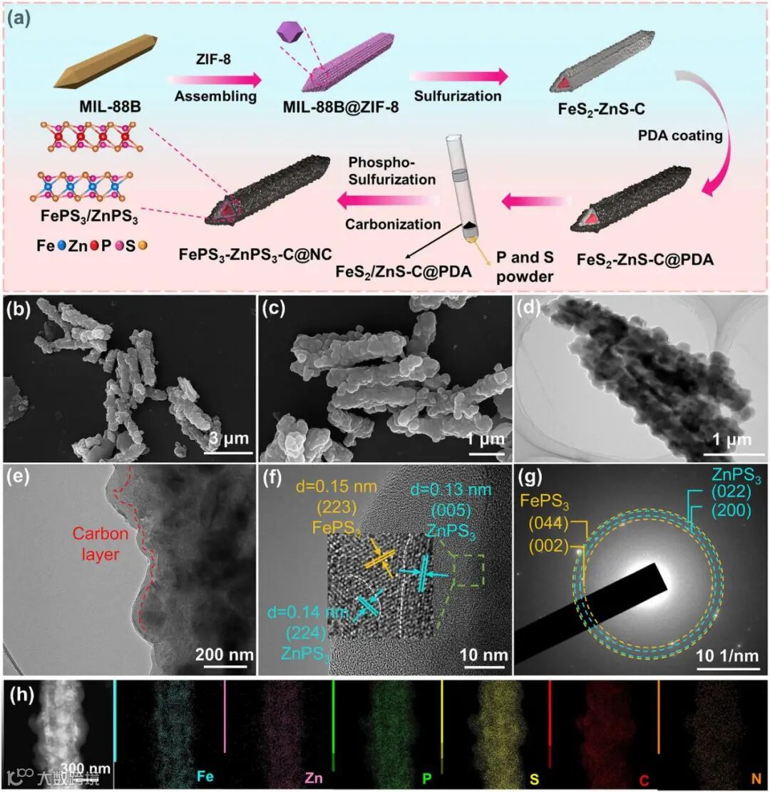 图1. (a) FePS3‑ZnPS3‑C@NC合成过程示意图;(b, c) SEM图像,(d, e) TEM图像,(f) HRTEM图像,(g) SAED图谱,(h) HAADF图像及所制备FePS3‑ZnPS3‑C@NC样品的相应EDS元素分布图。