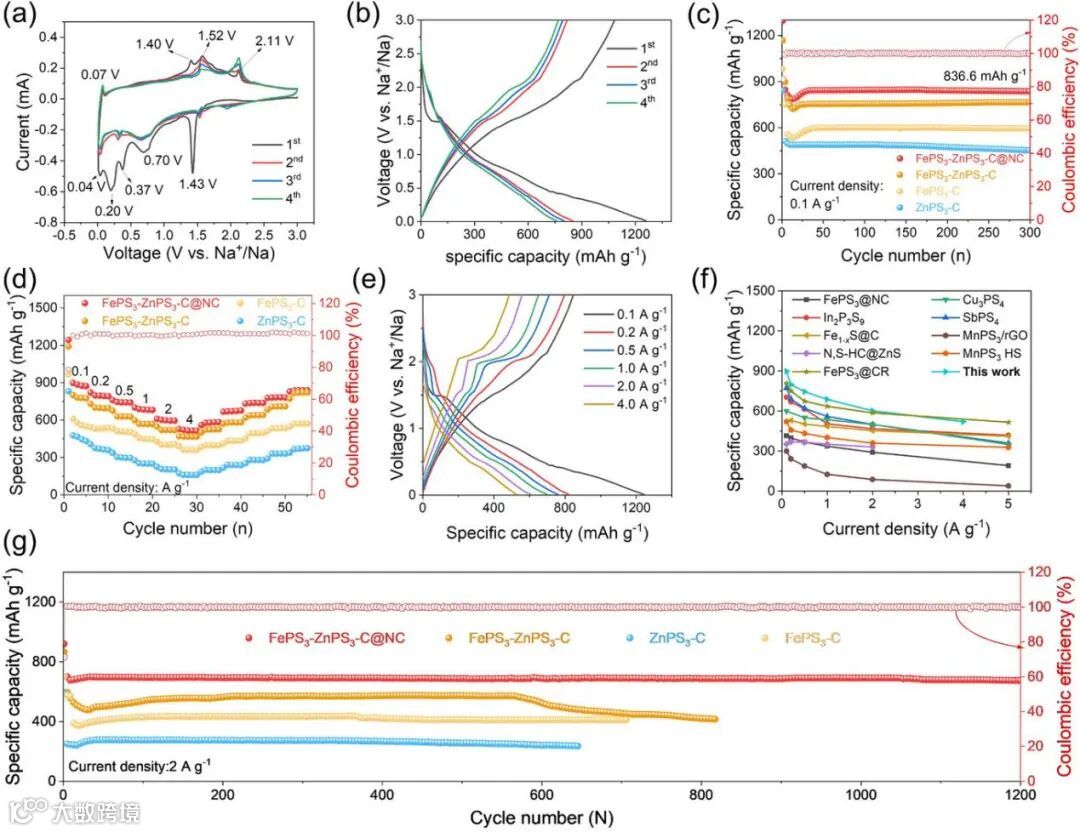 图3. (a) FePS3‑ZnPS3‑C@NC 电极在 0.1 mV s−1 下的 CV 曲线;(b) FePS3‑ZnPS3‑C@NC 电极在 0.1 A g−1下的充放电曲线;(c) FePS3‑ZnPS3‑C@NC、FePS3‑ZnPS3‑C、FePS3‑C 和 ZnPS3‑C 电极在 0.1 A g−1下的循环性能;(d) FePS3‑ZnPS3‑C@NC、FePS3‑ZnPS3‑C、FePS3‑C 和 ZnPS3‑C 电极在 0.1–4 A g−1 范围内的倍率性能;(e) FePS3‑ZnPS3‑C@NC 电极在不同电流密度下的充放电曲线;(f) FePS3‑ZnPS3‑C@NC 与已报道先进负极电化学性能的对比;(g) FePS3‑ZnPS3‑C@NC、FePS3‑ZnPS3‑C、FePS3‑C 和 ZnPS3‑C 电极在 2 A g−1下的长循环性能。