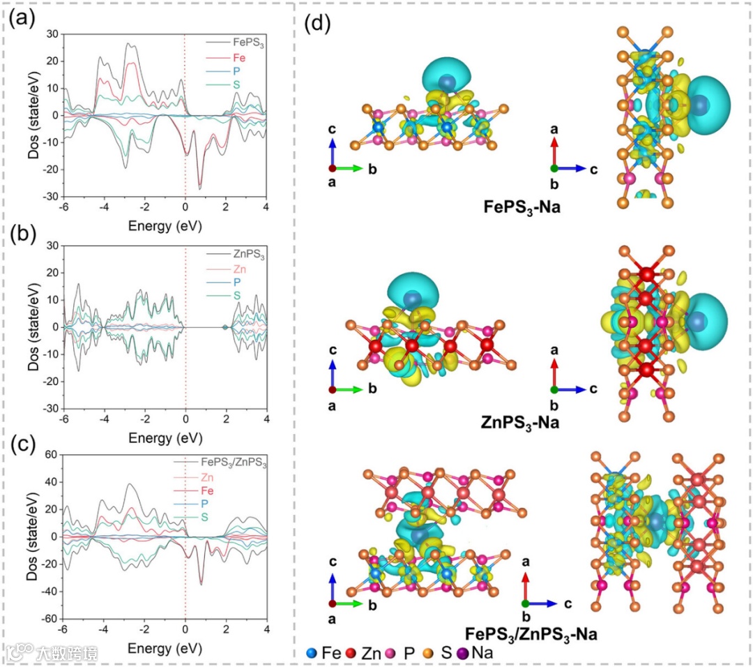 图4. (a) FePS3、(b) ZnPS3及 (c) FePS3/ZnPS3模型的态密度(TDOS)图;(d) Na+在 FePS3、ZnPS3和 FePS3/ZnPS3模型表面吸附的电荷密度差分图(不同视角)。