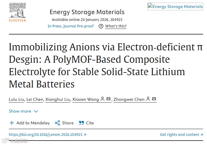 缺电子π结构设计与阴离子锚定策略:PolyMOF基复合电解质实现固态锂金属电池稳定运行