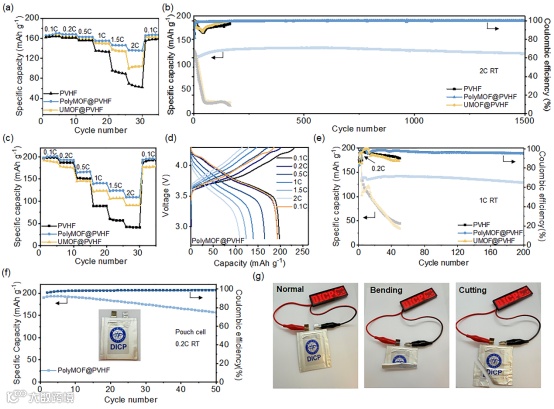 PolyMOF基电解质在室温下离子电导率为1.23×10-3 S cm-1,离子转移数高达0.75。所组装的LFP|Li电池在2C倍率下循环1500次后容量保持率达99.9%,NCM811|Li电池1C倍率下循环200次后仍保持93.5%的容量,其软包电池在多种苛刻条件下仍能稳定工作。