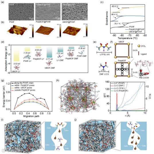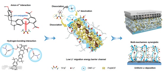 PolyMOF利用表面氢键与DMF溶剂作用,并通过纳米限域效应促进Li⁺脱溶剂化,构建的Li⁺传输通道具有极低能量势垒,实现了Li⁺的高效快速转移。