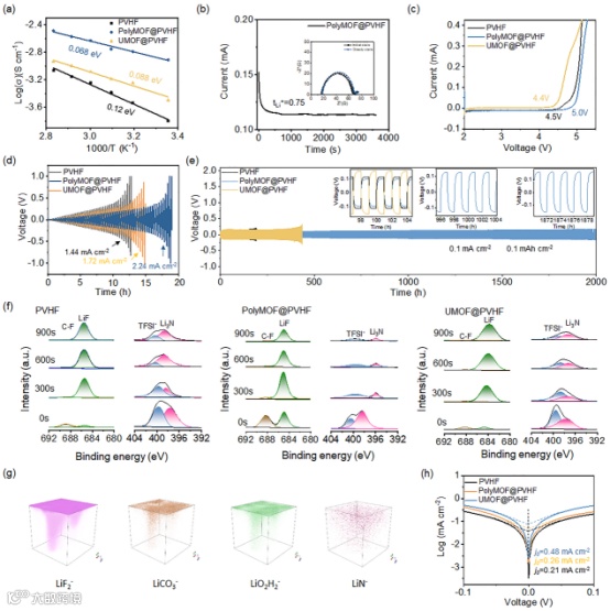 PolyMOF基电解质表现出较低的离子传输活化能、优异的室温离子电导率,Li⁺迁移数高达0.75,且电化学稳定窗口拓宽至5.0 V。通过XPS与TOF‑SIMS三维重建对SEI进行分析表明,PolyMOF基电解质可在锂金属表面形成致密均匀的SEI层,有效抑制了锂枝晶生长。而PVHF与UMOF@PVHF电解质形成的SEI层则较厚且不稳定。Tafel曲线进一步证实,PolyMOF@PVHF电解质中的多机制协同策略优化了电极/电解质界面,并显著提升了Li⁺的界面传输动力学。