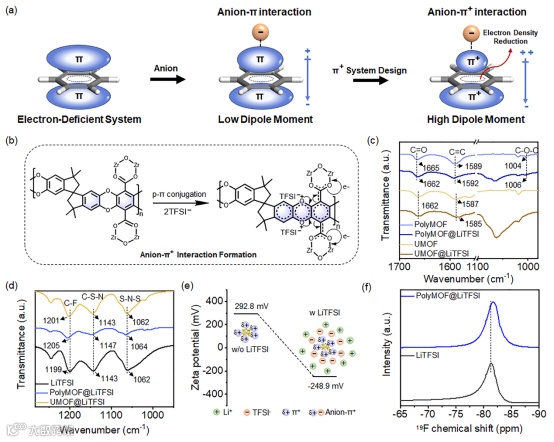 通过多种表征手段证实了PolyMOF与TFSI⁻之间存在显著的阴离子-π⁺相互作用。红外光谱表明,PolyMOF配体中的p-π共轭结构增强了电子离域,进而强化了配体与金属离子间的配位作用。该过程促使PolyMOF内部电子重新分布,降低了配体的电子云密度,形成了缺电子的π⁺芳香体系,从而增强了与TFSI⁻的相互作用。Zeta电位与核磁共振谱进一步证实了二者之间存在强的阴离子-π⁺作用。