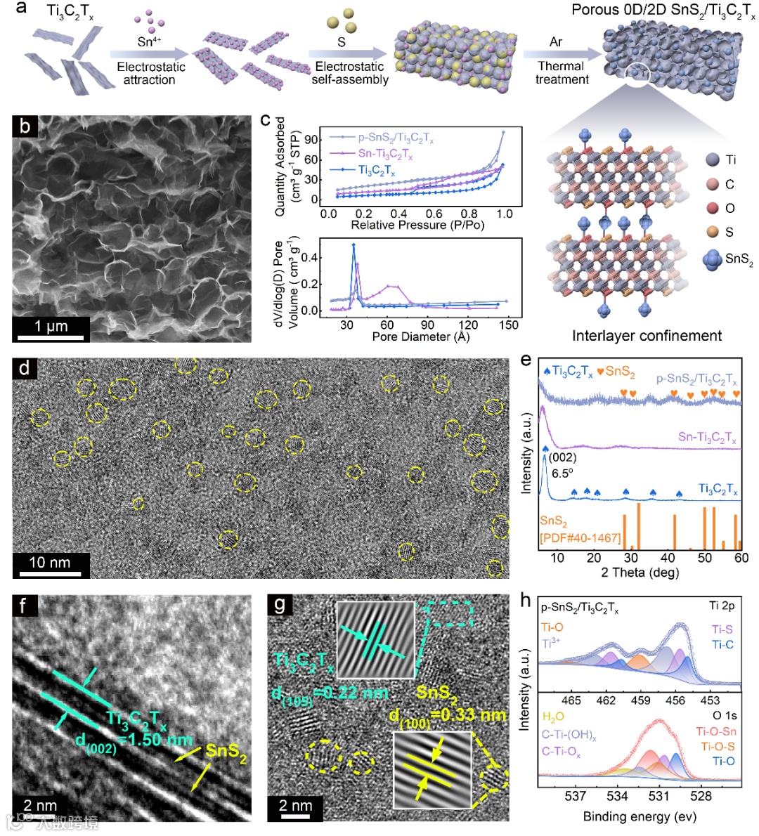 为了最大化活性表面积并缓冲体积膨胀,采用简便的原位热自组装策略,利用硫作为牺牲造孔剂,成功合成了具有分级孔结构的0D/2D p-SnS₂/Ti₃C₂Tₓ异质结。表征结果显示,超小尺寸的SnS₂量子点(1-5 nm)均匀分散并被牢固地限制在MXene扩大的层间(层间距~1.50 nm)。这种独特的纳米限域结构不仅防止了量子点的团聚和脱落,还为电解液的渗透提供了丰富的通道,极大地缩短了离子传输路径,为高倍率性能奠定了结构基础。