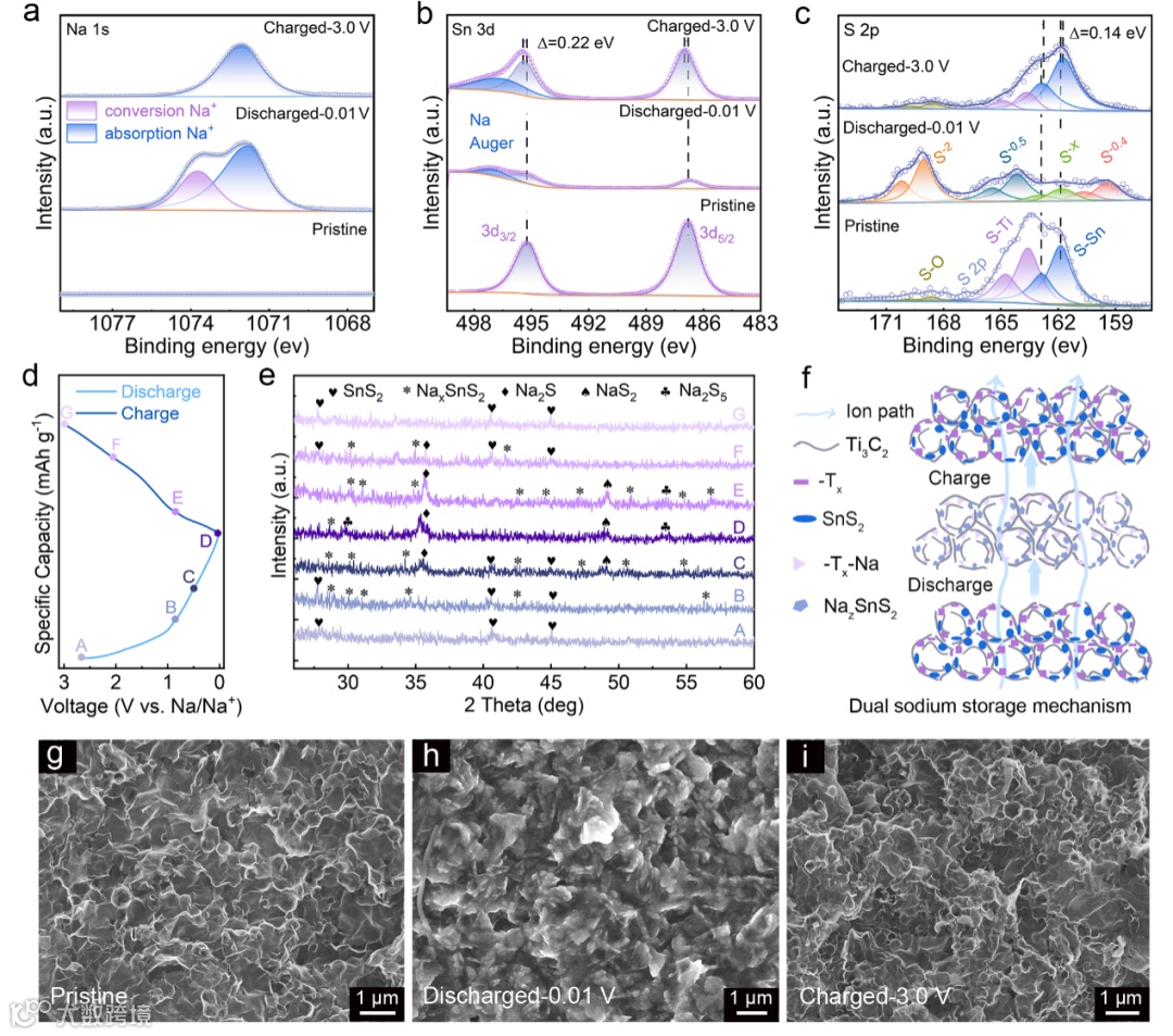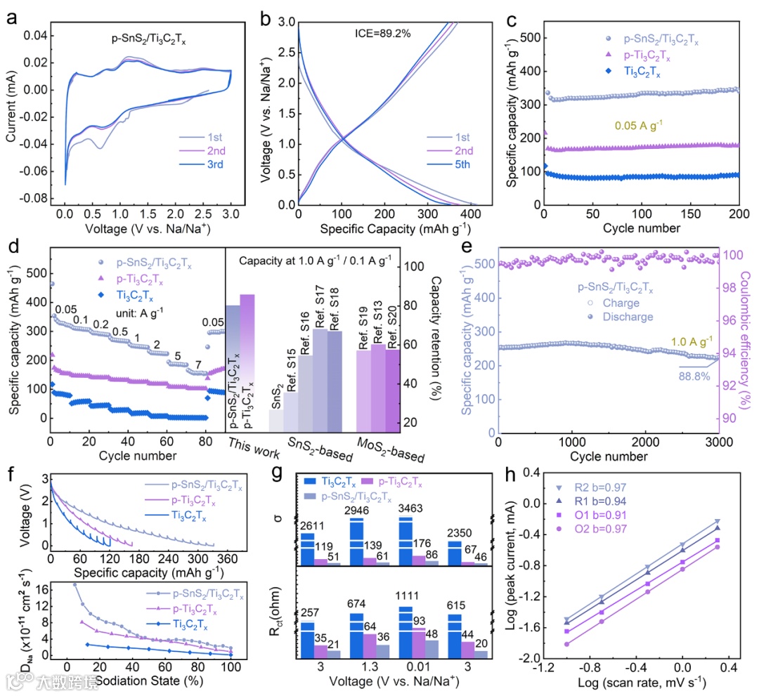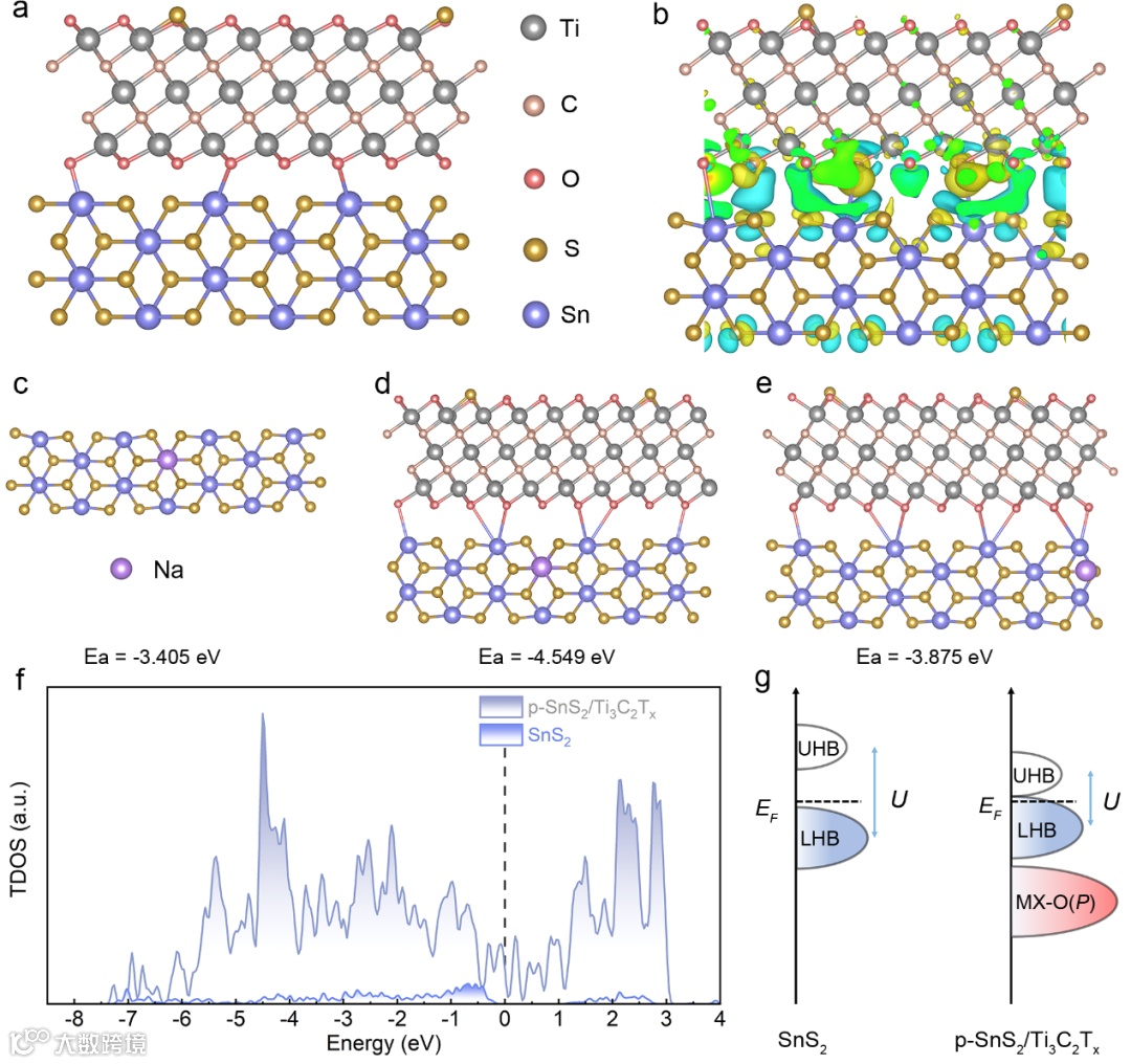 本研究的核心创新在于利用界面工程实现了储能机制的根本转变,并由此带来了卓越的电化学性能。得益于结构优势,p-SnS2/Ti3C2Tx负极在半电池测试中表现惊人。即使在 7 A g-1 的超高电流密度下,仍能保持 155 mAh g-1 的比容量。在 1 A g-1 大电流下循环 3000 次后,容量保持率高达 88.8%,远超纯 SnS2材料。动力学分析表明,该电极的储能行为发生了从扩散控制向表面控制的赝电容行为的转变(2 mV s-1 下电容贡献率达 94%)。非原位 XPS 和 XRD 证实了 SnS2在 MXene 限域下经历了高度可逆的多步转化反应,且 Ti-O-Sn 界面键在循环中保持稳定。DFT 计算深入揭示了微观起源。MXene 与 SnS2之间形成的 Ti-O-Sn 化学键充当“分子导线”,导致界面电荷重新分布并形成内建电场。这种界面耦合显著增加了费米能级处的态密度,并大幅降低了 Na⁺ 的吸附能和扩散能垒,从而在原子尺度上解释了“赝电容转变”的原因。