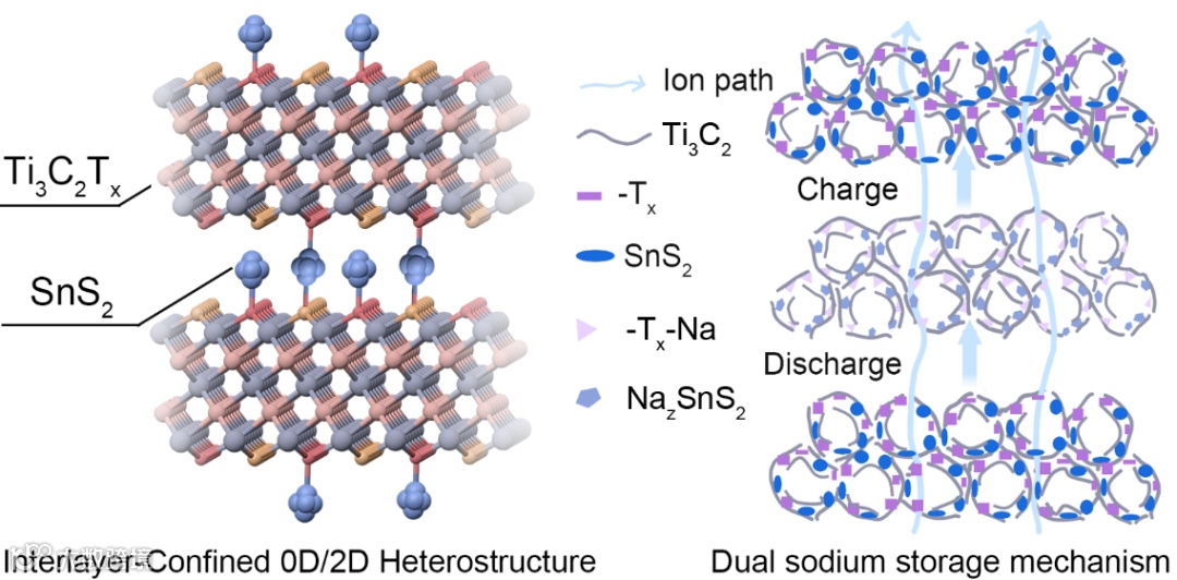钠离子电容器(SICs)结合了电池的高能量密度和超级电容器的高功率密度,是大规模储能的理想选择。然而,由于钠离子半径较大,导致反应动力学缓慢,且电池型负极材料(如金属硫化物)在循环过程中面临严重的体积膨胀和低电导率问题。这些缺陷使得电池型材料的电荷存储主要受扩散控制,难以在高倍率下有效运行,从而限制了SICs整体能量和功率密度的同步提升。尽管将金属硫化物与高导电性的MXene复合是解决上述问题的有效策略,但目前的复合材料多为简单的2D-2D堆叠,界面接触有限,且未能根本改变金属硫化物的扩散控制储能机制。因此,如何通过合理的电极设计,利用界面电子耦合诱导电池型材料发生“赝电容转变”,是实现高倍率、长寿命钠离子存储的关键挑战。