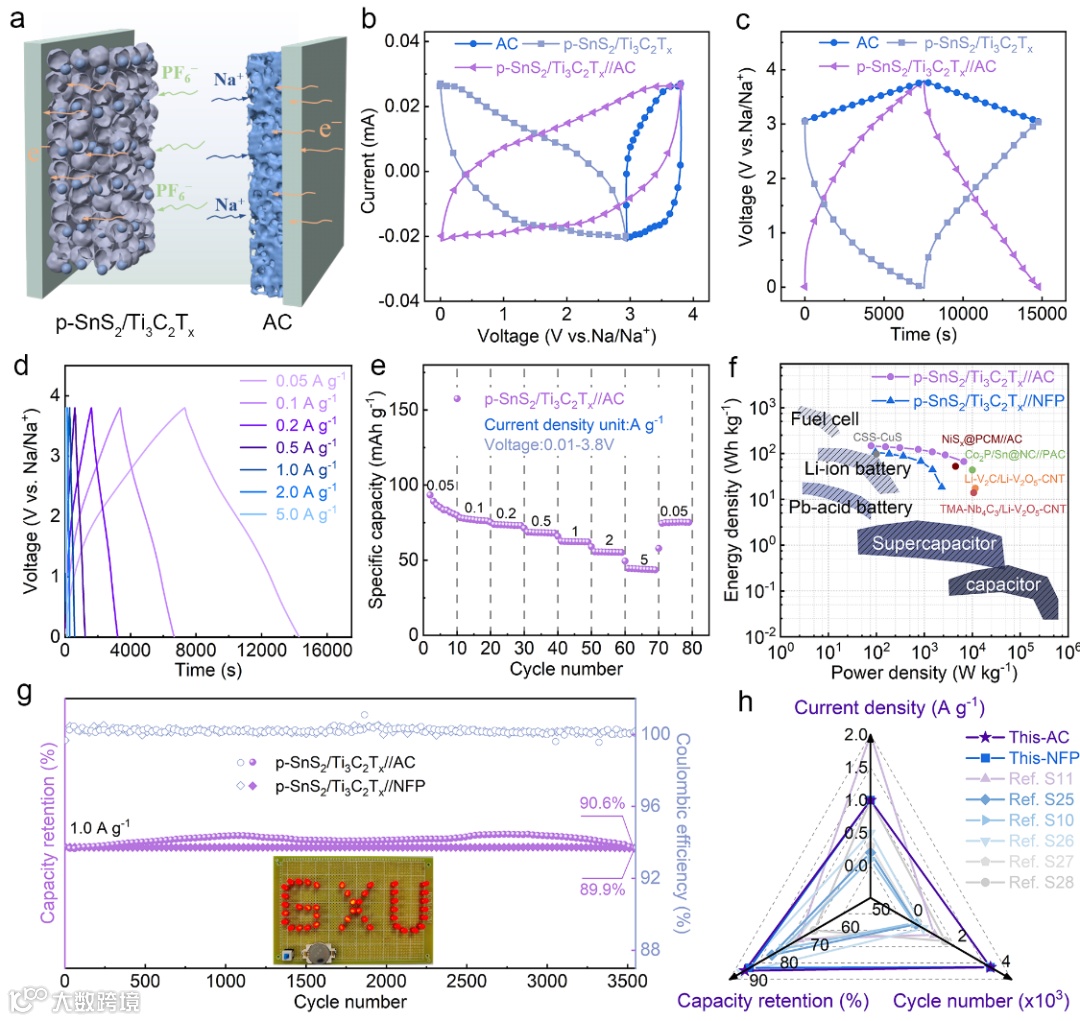 得益于上述结构和动力学优势,将 p-SnS2/Ti3C2Tx负极与活性炭(AC)正极组装成钠离子电容器(SIC)。该器件展现出优异的能量-功率特性:在 113.8 W kg-1 的功率密度下提供了 78.9 Wh kg-1 的能量密度;即便在 ~4.9 kW kg-1 的高功率输出下,能量密度仍保持在 57.9 Wh kg-1。此外,全电池在 1 A g-1 下循环 3500 次后容量保持率超过 90%,证明了该策略在构建高功率、长寿命储能器件方面的巨大潜力。