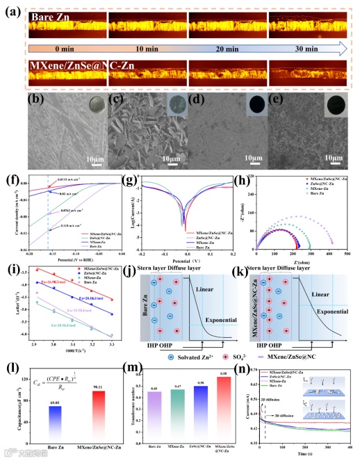 图2. (a)裸锌与MXene/ZnSe@NC-Zn电极在10 mA cm-²电流密度下锌沉积过程的原位光学显微图像;(b-e)裸锌(b,c)及MXene/ZnSe@NC-Zn(d,e)电极在2 mol·L-1 ZnSO₄电解液中浸泡7天前后的表面SEM图像;(f)线性扫描伏安(LSV)曲线;(g)塔菲尔(Tafel)极化曲线;(h)电化学阻抗谱(EIS)图;(i)活化能(Eₐ)阿伦尼乌斯拟合图;(j,k)锌沉积过程中裸锌与MXene/ZnSe@NC-Zn电极界面处电化学双电层(EDL)结构示意图;(l)对应双电层电容测试结果;(m)基于Bruce-Vincent法计算的Zn2+离子迁移数;(n)不同电极界面在−100 mV过电位下的恒电位阶跃(CA)曲线。