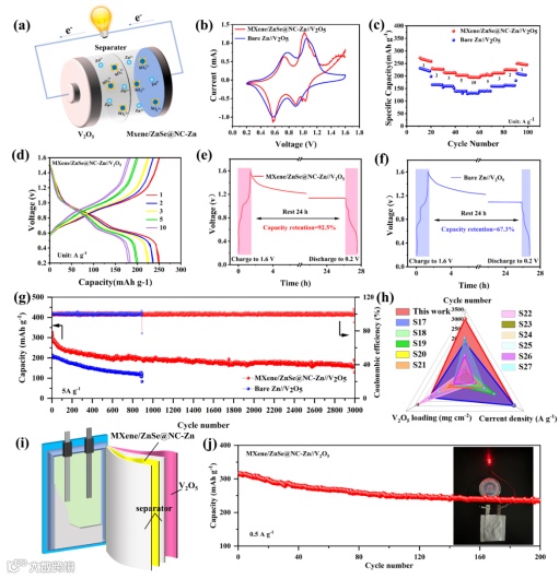 图 7. (a)MXene/ZnSe@NC-Zn //V2O5全电池的示意图,(b)在扫描速率为 0.1 mV s-1 的条件下,在 0.2 - 1.6 V 范围内的循环伏安曲线,(c)放电速率性能,(d)在不同电流密度下的恒流充电 - 放电曲线,(e、f)静置 24 小时后的自放电行为,(g)各种全电池的长期循环稳定性测试。(h)与已报道的全电池的比较电化学性能。(i)软包AZIB 的示意图,(j)软包电池的循环性能(插图为供电给 LED 灯的软包电池的照片)。