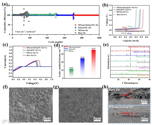 图4. Zn//Cu半电池电化学性能与界面表征:(a)库仑效率(CE)随循环次数的变化;(b)首圈恒电流充放电(GCD)曲线;(c)扫描速率为0.1 mV s-1的循环伏安(CV)曲线;(d)MXene,ZnSe@NC及MXene/ZnSe@NC三层材料在裸锌基底上的离子电导率对比;(e)100次循环后各负极的X射线衍射(XRD)图谱;(f,g)50次循环后裸锌与MXene/ZnSe@NC-Zn负极的顶视扫描电子显微镜(SEM)图像;(h)对应负极的横截面SEM图像。
