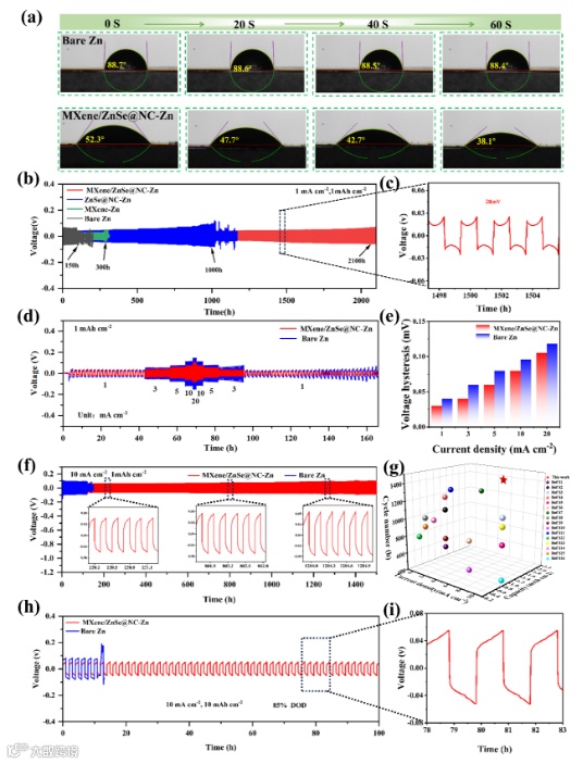 图3. (a)裸锌与MXene/ZnSe@NC-Zn电极在2 mol·L-1 ZnSO4电解液中的动态接触角随时间演变曲线;(b)1.0 mA cm-2(面容量1.0 mAh cm-2)下各类对称Zn//Zn电池的长期恒流循环稳定性;(c)MXene/ZnSe@NC-Zn对称电池对应循环区间的放大电压曲线,清晰呈现其低滞后,高可逆的充放电特征;(d)裸锌与MXene/ZnSe@NC-Zn电极在1–20 mA cm-2电流密度范围内的倍率性能;(e)对应电流密度下的电压滞后值;(f)10 mA cm-2高倍率下裸锌与MXene/ZnSe@NC-Zn对称电池的超长循环稳定性对比;(g)MXene/ZnSe@NC-Zn电池循环寿命与文献报道的MXene基人工界面保护策略的对比汇总;(h)85%高放电深度(DODZn)下两类对称电池的锌沉积/剥离电压响应;(i)MXene/ZnSe@NC-Zn电极在该工况下的放大电压曲线,凸显其优异的界面动力学稳定性。