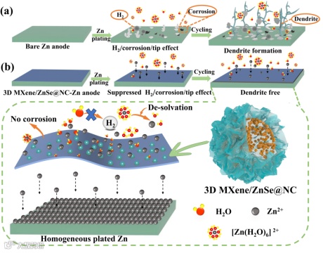 图1. AZIBs 中锌在(a)裸锌以及(b)MXene/ZnSe@NC-Zn 基底上的沉积,及3D球形空间域保护层设计示意图。