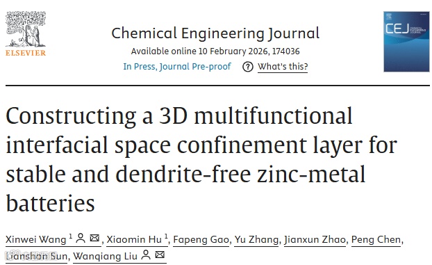 近日,长春理工大学王新伟副教授,刘万强教授的团队,在国际知名期刊Chemical Engineering Journal上发表题为“Constructing a 3D Multifunctional Interfacial Space Confinement Layer for Stable and Dendrite-free Zinc-Metal Batteries”的文章。该课题组提出一种界面空间限域策略:通过构筑3D纳米球结构的多功能保护层(MXene/ZnSe@NC),实现无枝晶锌负极的理性设计与长效稳定运行,及卓越循环稳定性(10 mA cm-2下稳定运行1500 h)和高达85%的锌利用率。进而,MXene/ZnSe@NC-Zn//V2O5全电池在5 A g-1下循环3000周后仍保持202 mAh g-1比容量;对应软包电池在0.5 A g-1下循环200周后容量达248 mAh g-1。本工作发展了一种面向锌负极界面结构精准调控的新型限域工程范式,为高性能,长寿命AZIBs的实用化提供了重要路径。