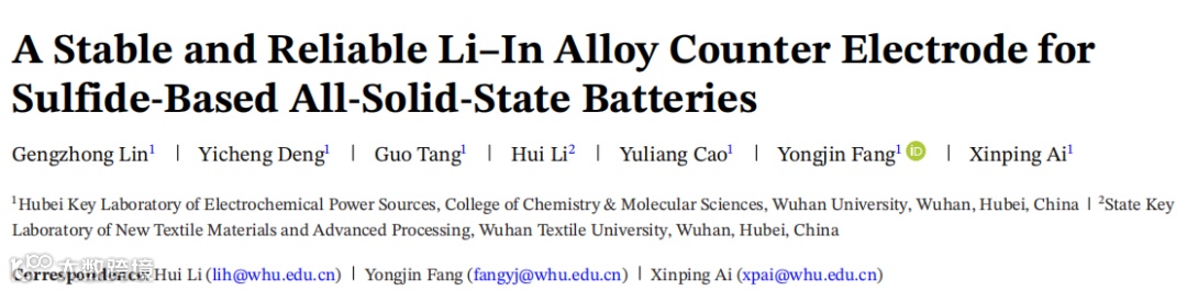 近日,武汉大学艾新平教授、方永进教授联合武汉纺织大学李惠博士团队在Advanced Energy Materials上发表了题为“A Stable and Reliable Li-In Alloy Counter Electrode for Sulfide-Based All-Solid-State Batteries”的研究论文。该工作开发了一种创新的化学预锂化策略,成功制备出成分均一、结构可控的锂铟合金对电极。该研究利用萘锂/二甲氧基乙烷(Li-Naph/DME)溶液作为预锂化剂,通过精确控制其与铟箔的化学计量比,实现了对合金相组成的精准调控,获得了具有均匀LiIn/In两相结构的合金粉末(记为PL-LiIn/In)。
