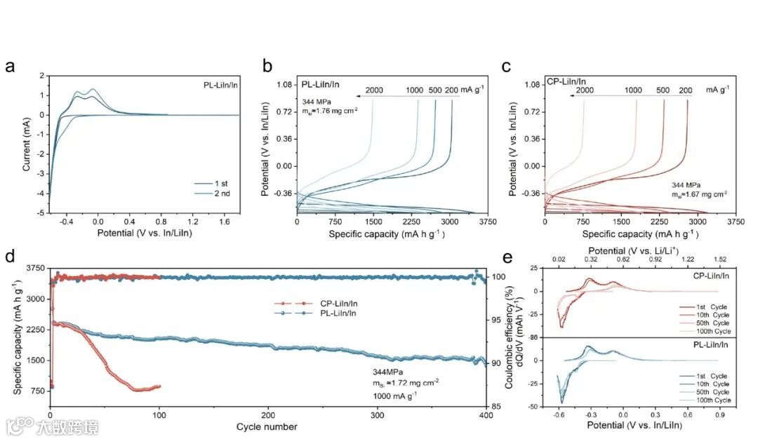 高容量与优异倍率性能:在高载量下,PL-LiIn/In电极的脱锂容量远超冷压电极,且在高电流下容量保持率更高。