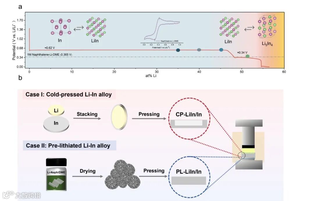 图1. a) 铟箔在LPSC电解质中的恒电流锂化曲线(插图:Pt微电极在Li-Naph/DME溶液中的循环伏安曲线);b) 传统冷压法(I)与化学预锂化法(II)制备Li-In合金对电极的示意图对比