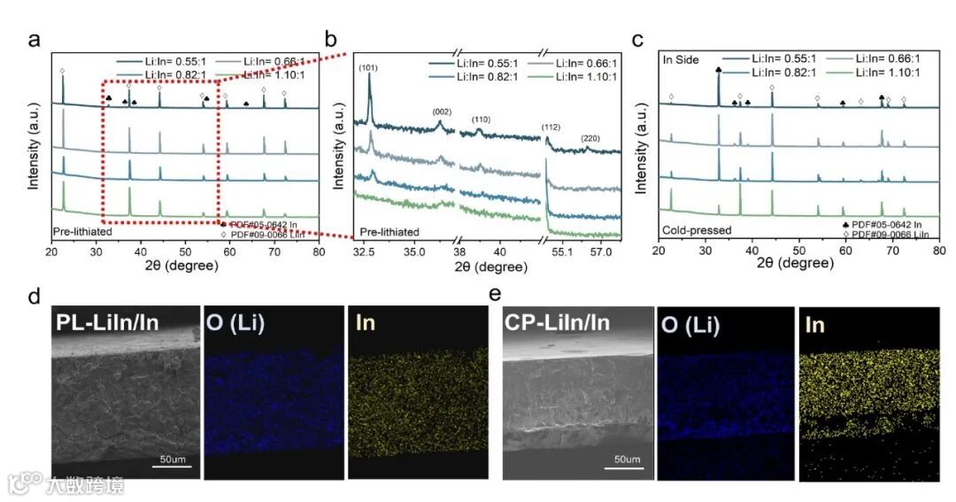 图2. 预锂化法与冷压法制备的Li-In合金的相组成与元素分布:(a, b) 不同Li/In摩尔比预锂化合金的XRD图谱;(c) 冷压合金(铟箔侧)的XRD图谱;(d, e) PL-LiIn/In与CP-LiIn/In电极截面的SEM及O、In元素分布Mapping图,显示预锂化电极成分高度均匀。