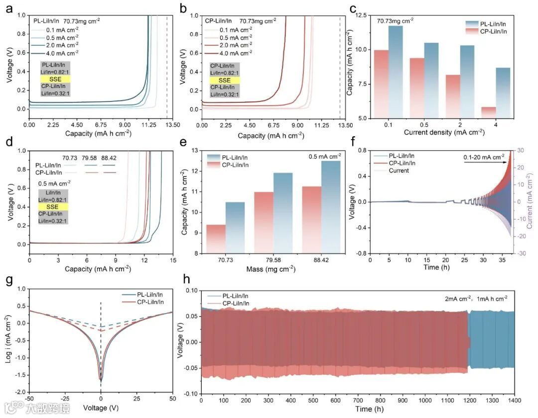 图4. PL-LiIn/In与CP-LiIn/In电极的电化学性能对比:(a, b) 不同电流密度下的恒电流脱出曲线及(c)对应的平台容量;(d, e) 不同载量下的性能;(f) 临界电流密度测试;(g) 塔菲尔曲线;(h) 长循环性能。