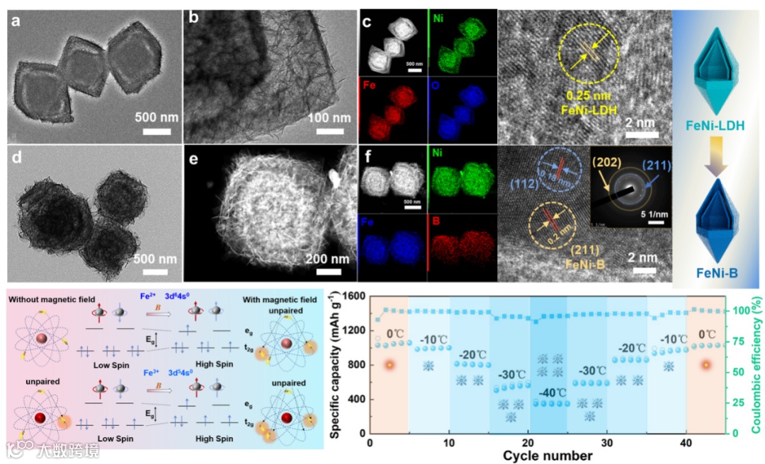 研究团队以具有独特锥形结构的Fe-MOF为前驱体,通过一种巧妙的协调反应级联策略,成功构建了具有双锥双层中空结构的硼化铁镍材料。该结构不仅极大提高了比表面积,为硫物种的吸附和转化提供了丰富的反应场所,其独特的反应器架构还有效提升了空间利用效率和循环稳定性。更重要的是,Fe和Ni原子未配对的3d电子通过交换相互作用形成了磁矩网络,使该材料具备优异的磁场响应能力,为后续的磁场调控奠定了基础。