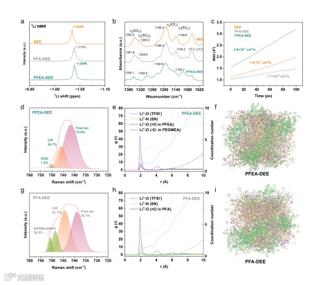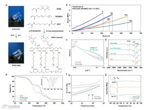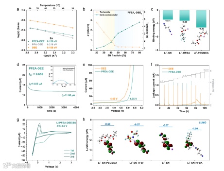 得益于独特的微观结构,优化后的PFEA-DEE电解质展现出优异的综合理化与电化学性能,打破了传统性能博弈。电化学测试表明,该电解质表现出高达 570% 的卓越拉伸应变,还具备 1.69 mS cm-1(30°C)的高离子电导率。此外,富氟骨架的化学锚定效应和聚合物网络的物理限域作用协同固定了TFSI⁻阴离子,使其锂离子迁移数大幅提升至0.655 。同时,氟化组分与强吸电子基团的引入,使体系的氧化电位拓宽至4.95 V,展现出卓越的高压耐受性 。