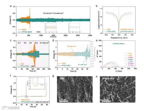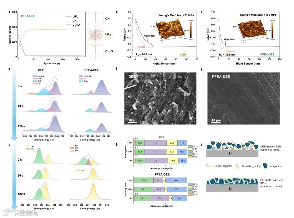 PFEA-DEE 不仅在离子传导上表现优异,其更能在锂金属负极表面诱导形成稳定保护。在物理层面,原位聚合形成的连续弹性网络能够作为强大的机械缓冲层,有效抵抗锂负极在充放电过程中的体积膨胀和外部应力,从而物理抑制锂枝晶的刺穿。在化学层面,热力学优先还原的 HFBA 与抗还原能力极强的 PEGMEA 共同作用,在锂金属表面形成了梯度SEI层,其内层富含无机的 LiF 以提供高硬度,外层则富含有机柔性成分以提供韧性。在此协同保护下,Li/Li 对称电池的临界电流密度(CCD)突破至 4.1 mA cm-2,并在 0.2 mA cm-2 条件下实现了长达 3000 小时的稳定沉积/剥离。
