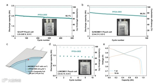 将该电解质应用于Ah级软包电池中进行系统性评估,也表现出了良好的可逆循环能力。这一系列成果有力地证实了PFEA-DEE在提升高能量密度锂电池的安全性和循环寿命方面具有显著的实用价值,为其从基础研究走向产业化应用奠定了坚实的基础。